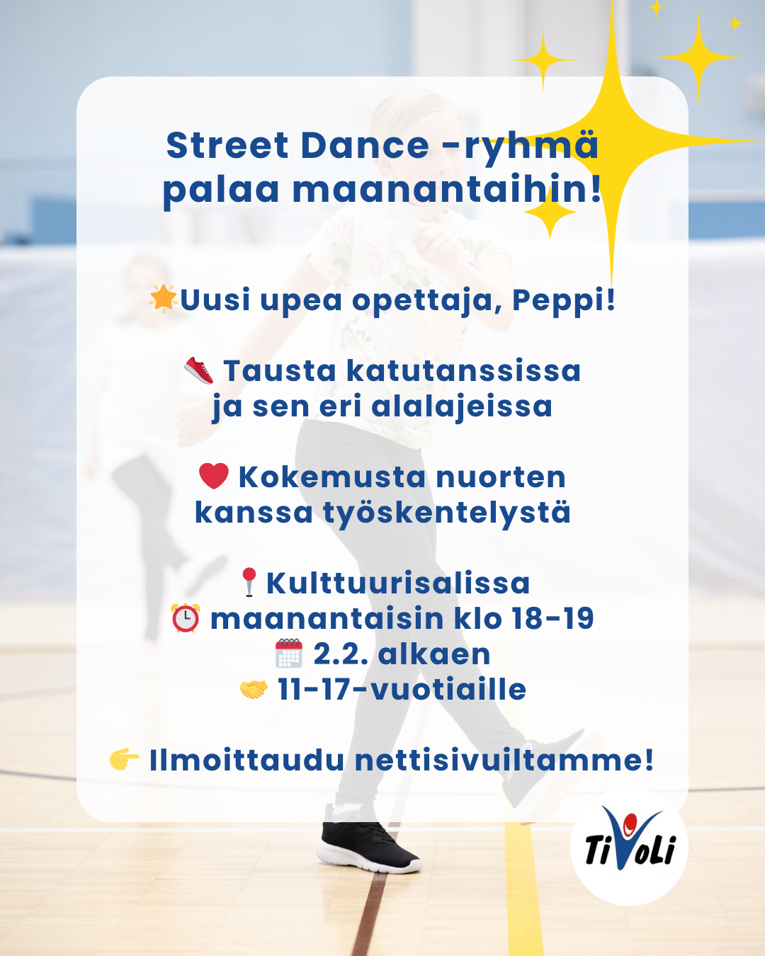 Kuva: Iina Kautto Iloksemme voimme ilmoittaa, että olemme löytäneet mahtavan uuden opettajan Street Dance -ryhmään! Pepillä on pitkä ja monipuolinen tausta katutanssista ja sen eri alalajeista ja…