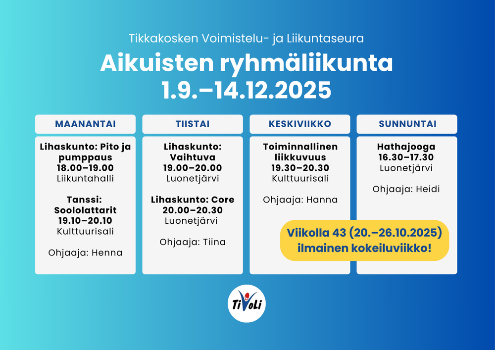 Syksyn 2025 aikuisten liikuntaryhmät starttaavat jälleen kokeneiden ja koulutettujen ohjaajien johdolla. TiVoLin aikuisten ryhmät tarjoavat laadukasta, tavoitteellista ja innostavaa liikuntaa.…