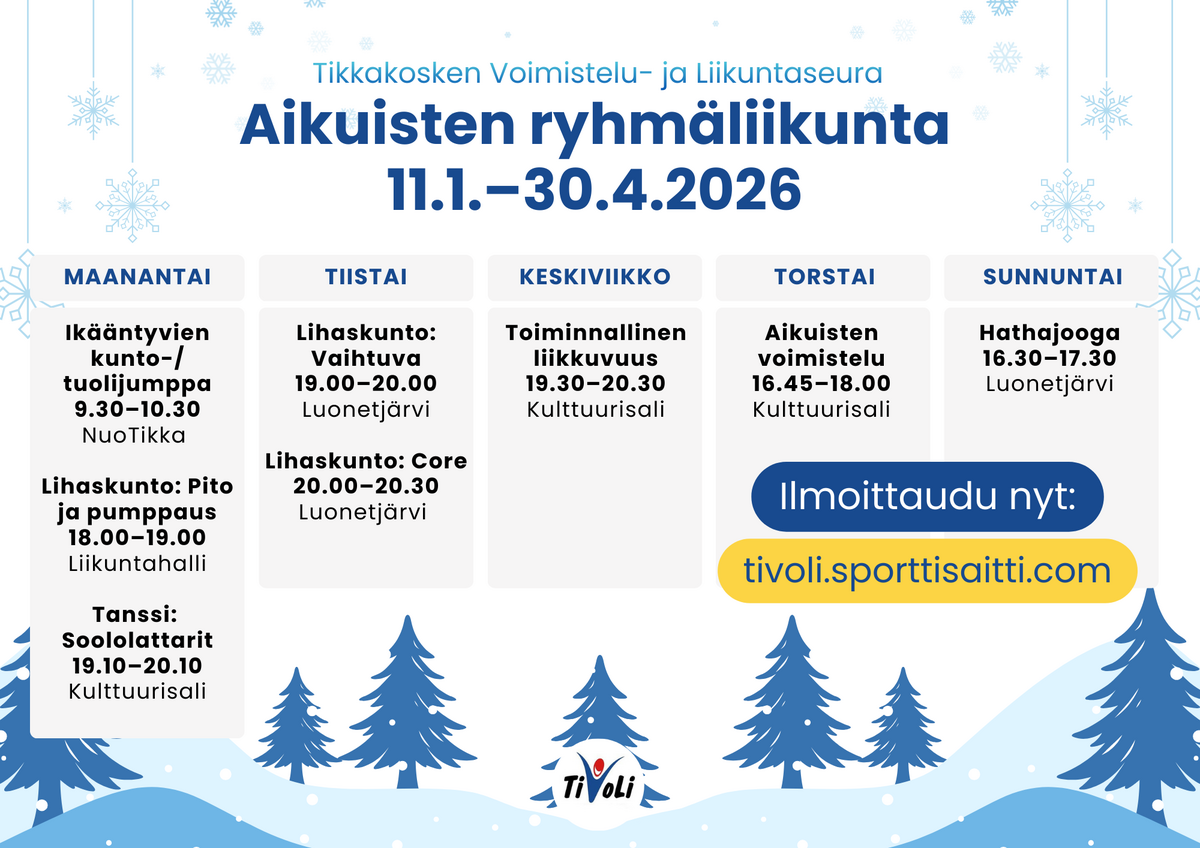 Lisätietoja aikuisten ryhmäliikunnasta Tikkakoskella sekä hinnoittelusta löydät sivuiltamme täältä.