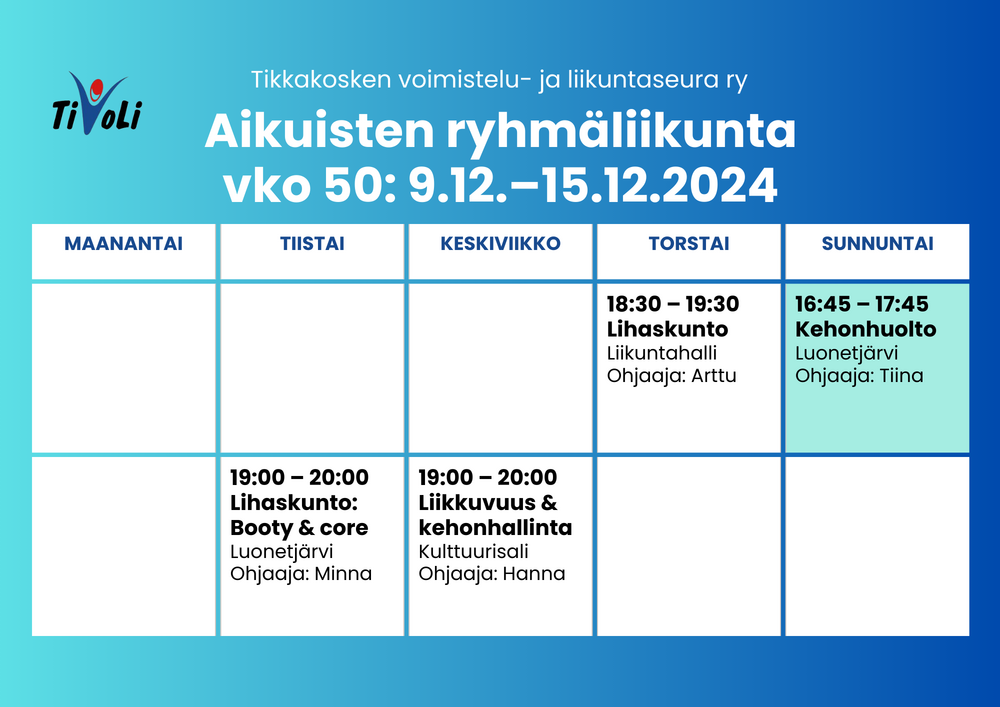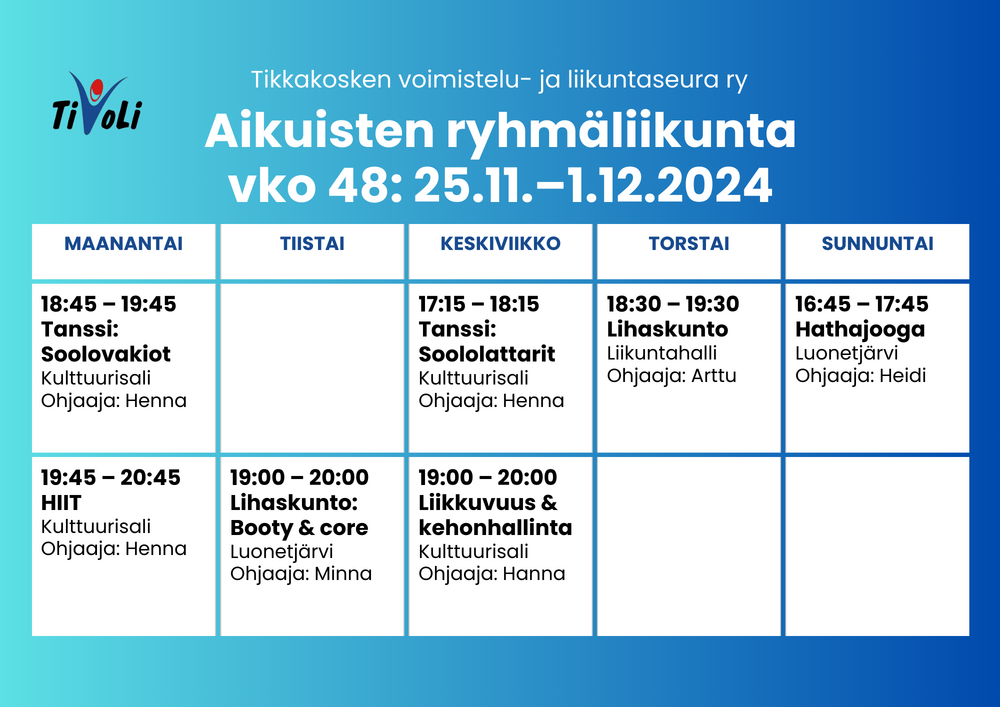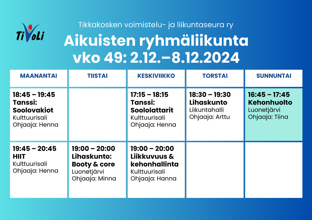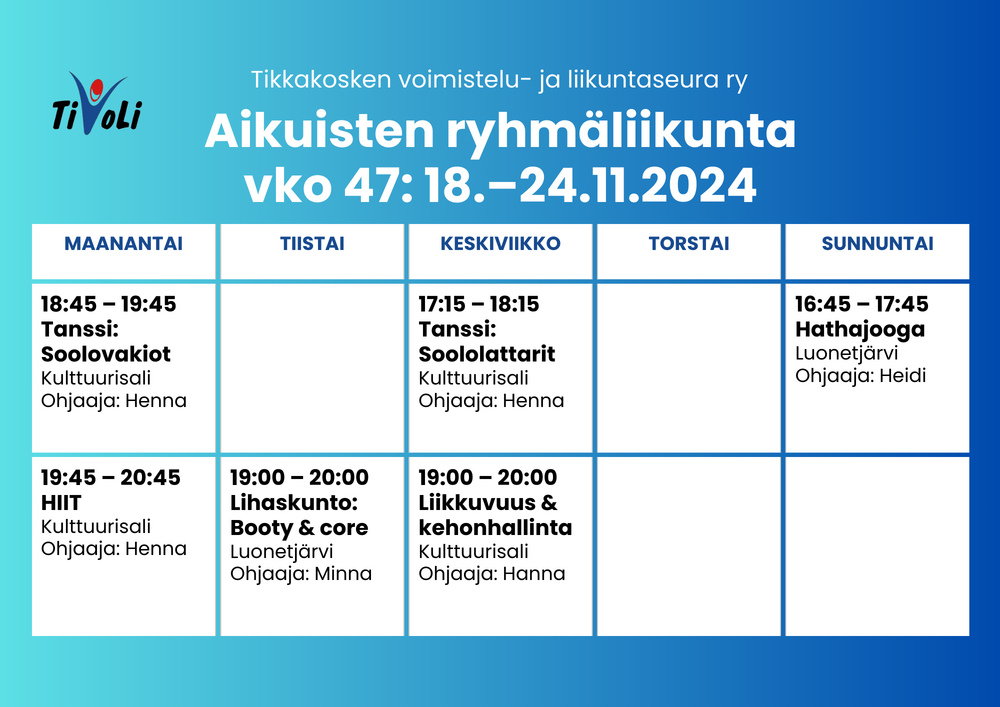 TiVoLin syyskausi lähenee loppuaan, mutta vielä ennättää hyvin mukaan liikkumaan ja vaikka kokeilemaan ryhmäliikuntaa. Seuraathan tiedotustamme, sillä Black Week -kampanjamme starttaa 25.11.2024! Muistathan myös, että nyt on hyvä hetki käyttää liikuntaedut vielä tälle vuodelle.
