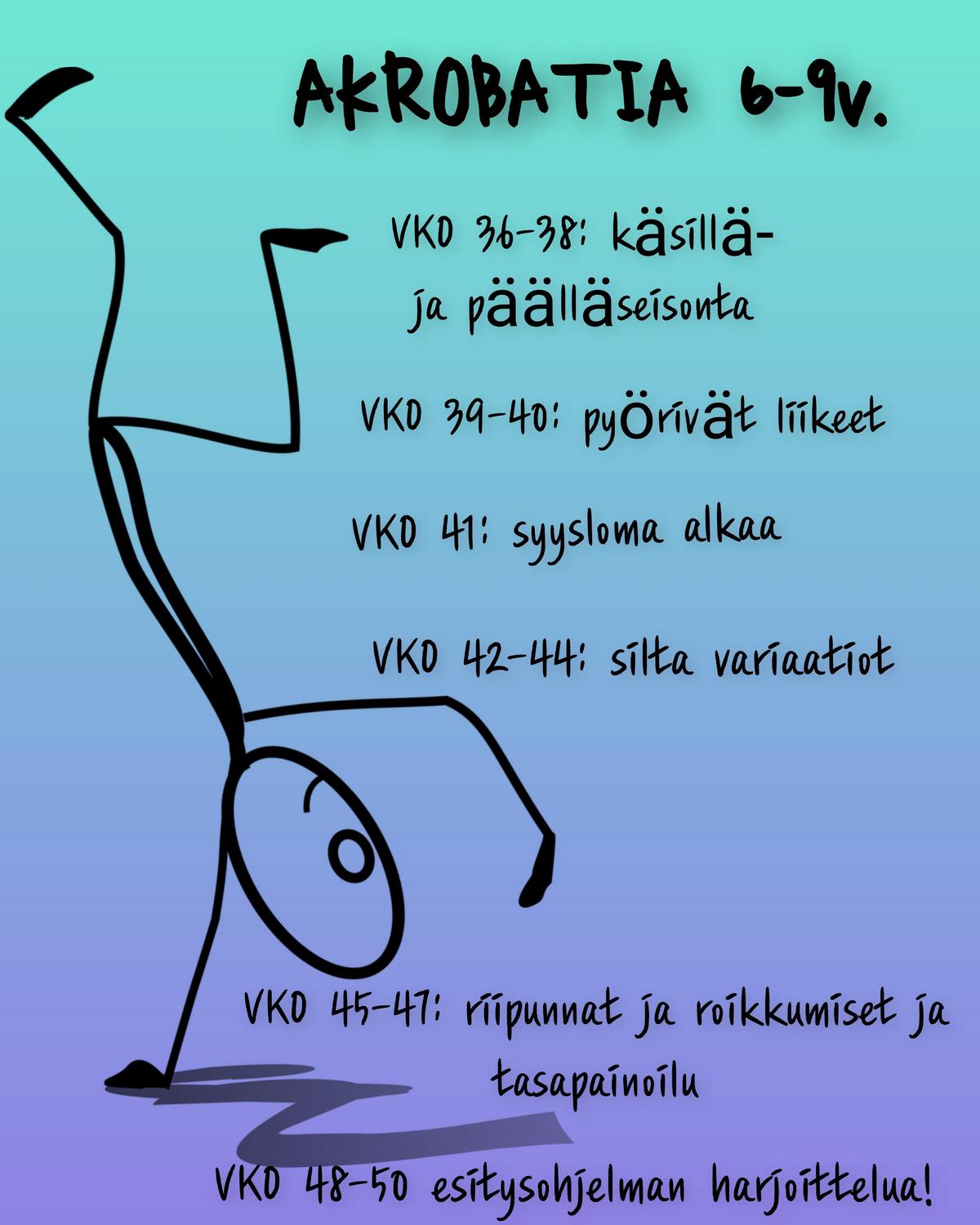 Monipuolista liikettä kasvavalle lapselle. Akrobatia-tunti kehittää ketteryyttä, voimaa, vartalon hallintaa ja oman kehon tuntemusta, tasapainoa, uskallusta sekä nivelten ja lihasten liikkuvuutta ja liikehallintaa. Tunnilla hyödynnetään välineistöä, ja tunnilta löydät elementtejä myös mm. sirkuksesta, voimistelusta, joogasta ja vikellyksestä!